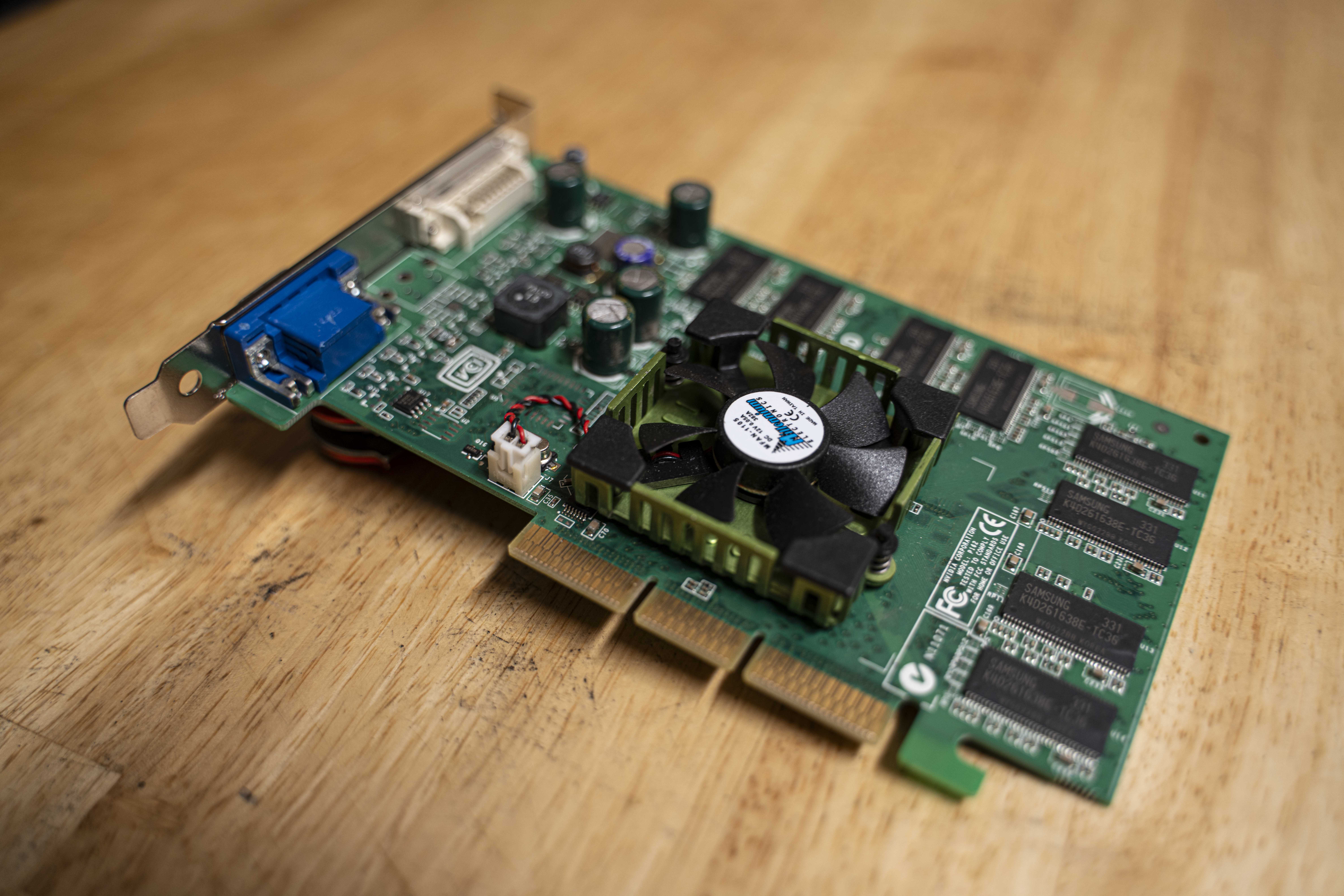 This is my primary graphics card: an Nvidia Quadro FX 500. It sports 128MiB of DDR SDRAM for VRAM and a core that is fully certified for OpenGL 1.5 and partially certified for OpenGL 2.1. I bought it as a baseline for immediate-mode-style GL programming that is more era-correct than the other, more anachronistic GL 1.x chips I have (namely the GMA 3150 on Jericho).