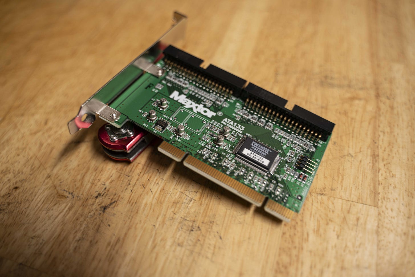 This is the supplementary IDE card (also from Maxtor 💛) which takes four of the six hard disk drives. The other two will occupy the primary slave and secondary slave positions on the motherboard’s IDE cables that run to the boot drive and the DVD writer.