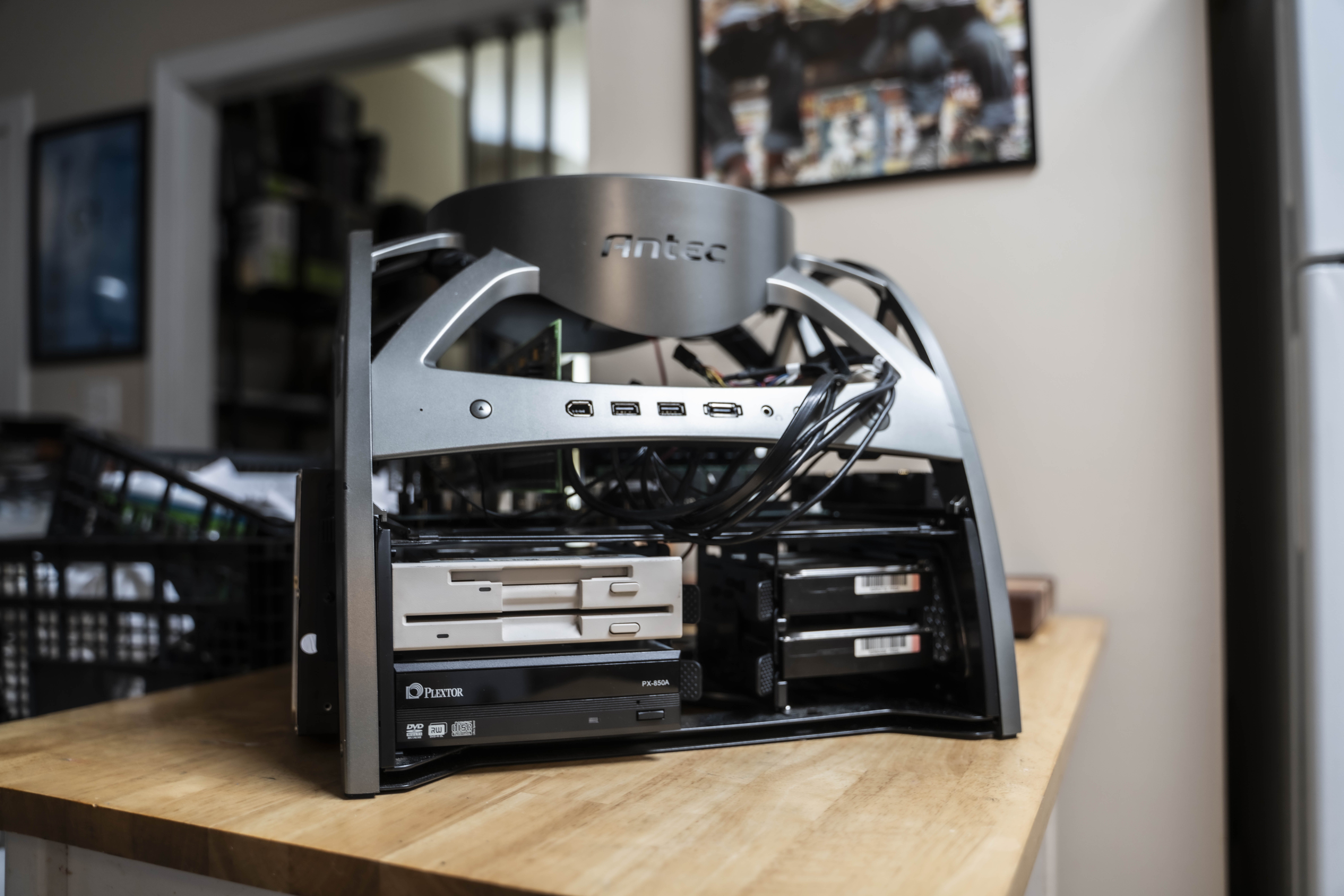 Now that all the parts are in, I can say absolutely none of those front ports you see will be functional in any way. That said, the power and reset switches will both be fully functional, and their LEDs will work swimmingly too. And yes, that is a 5¼″ and 3½″ combo floppy drive. It might be my favourite part of the build.